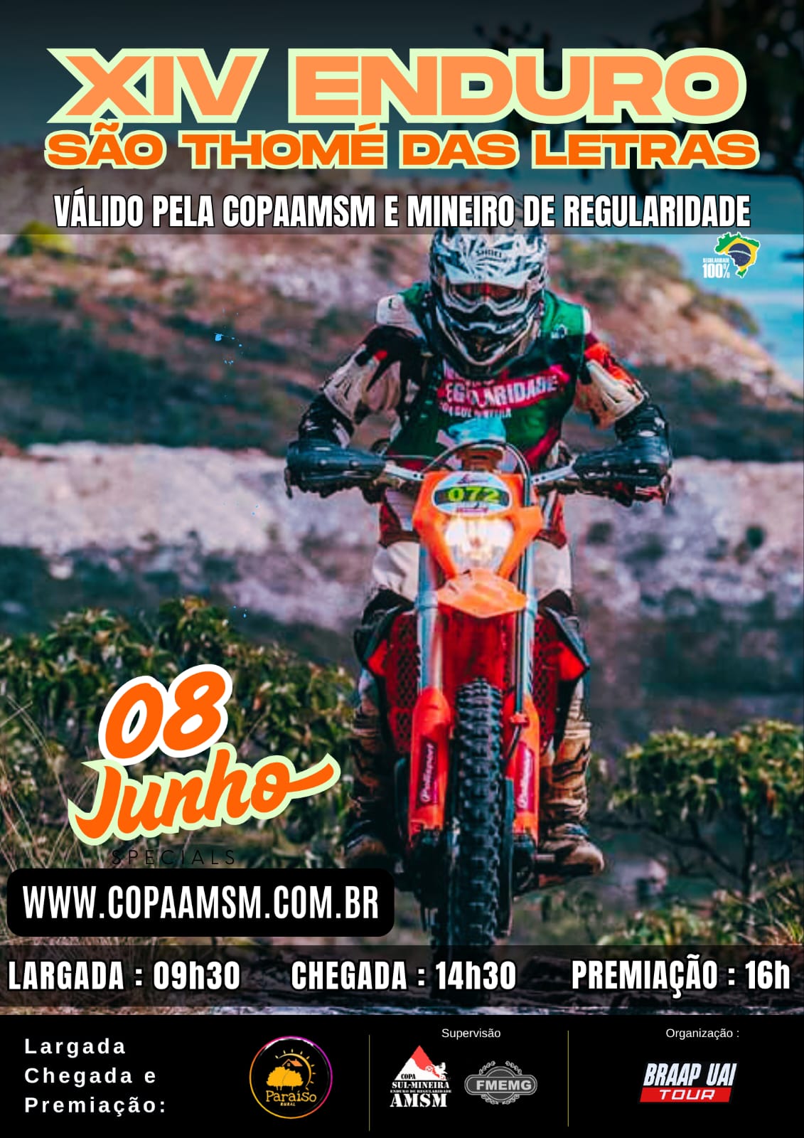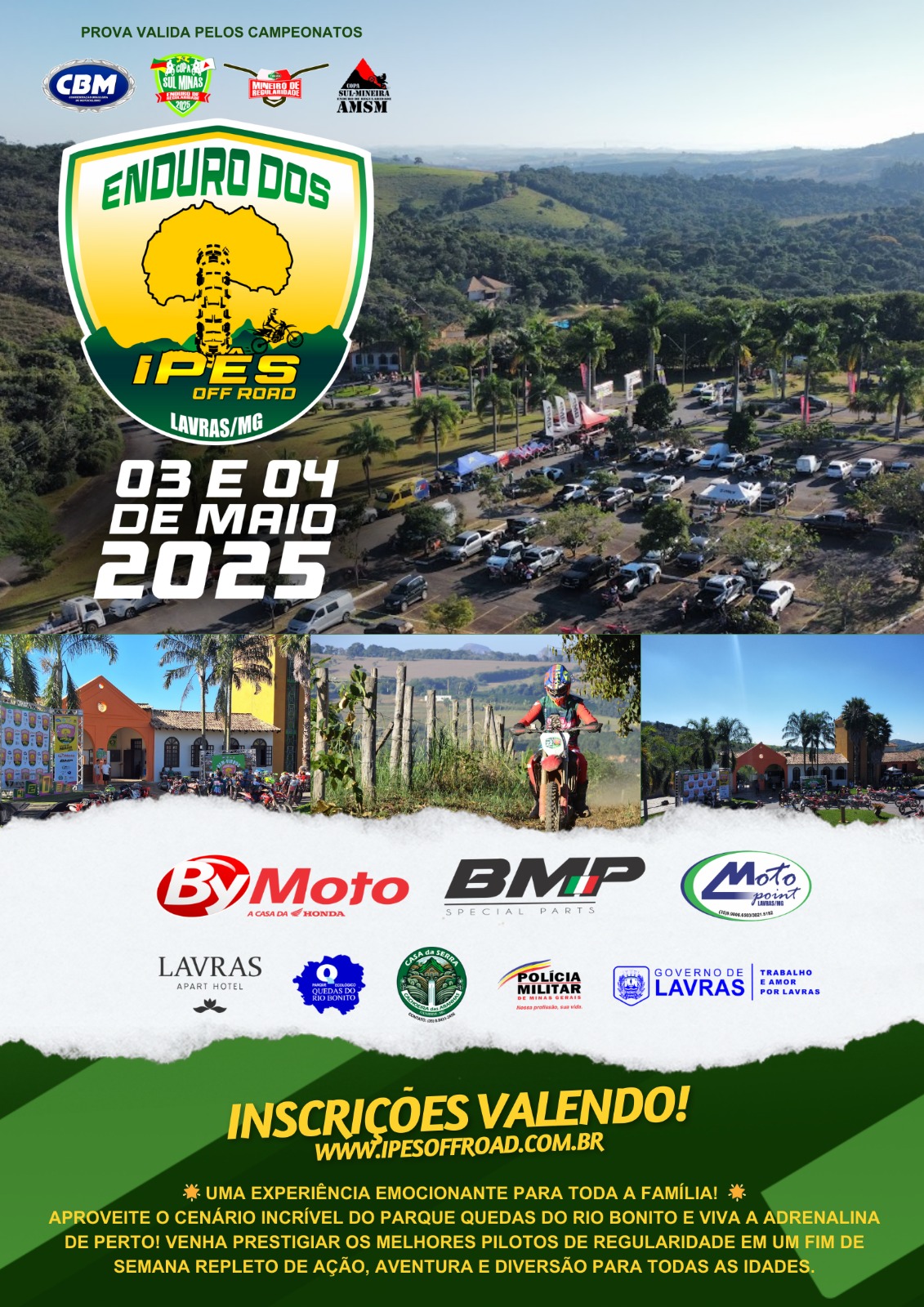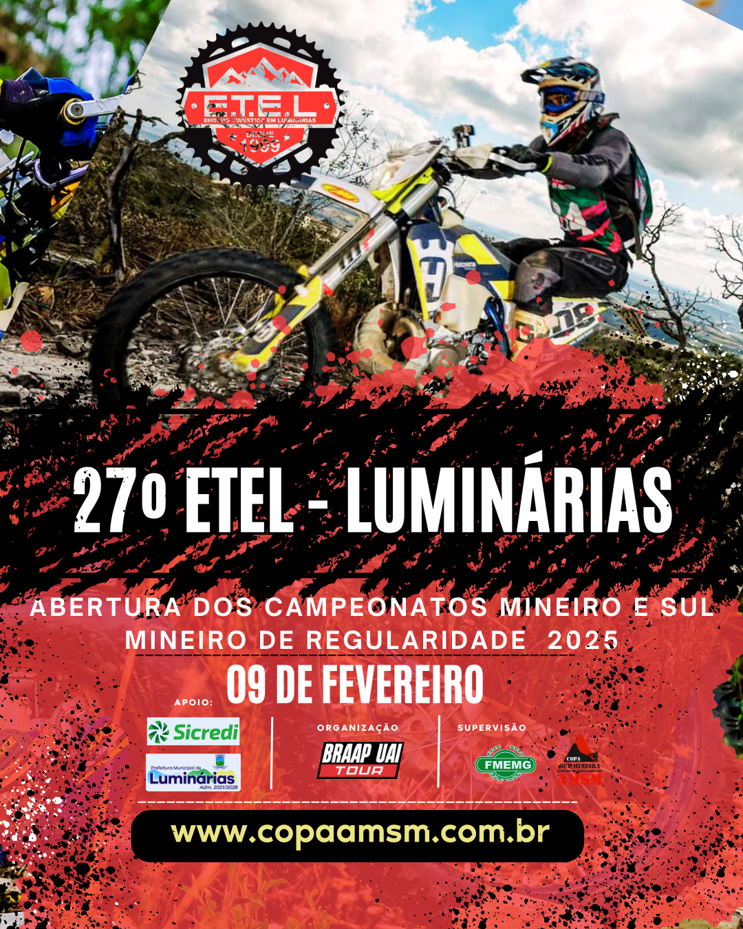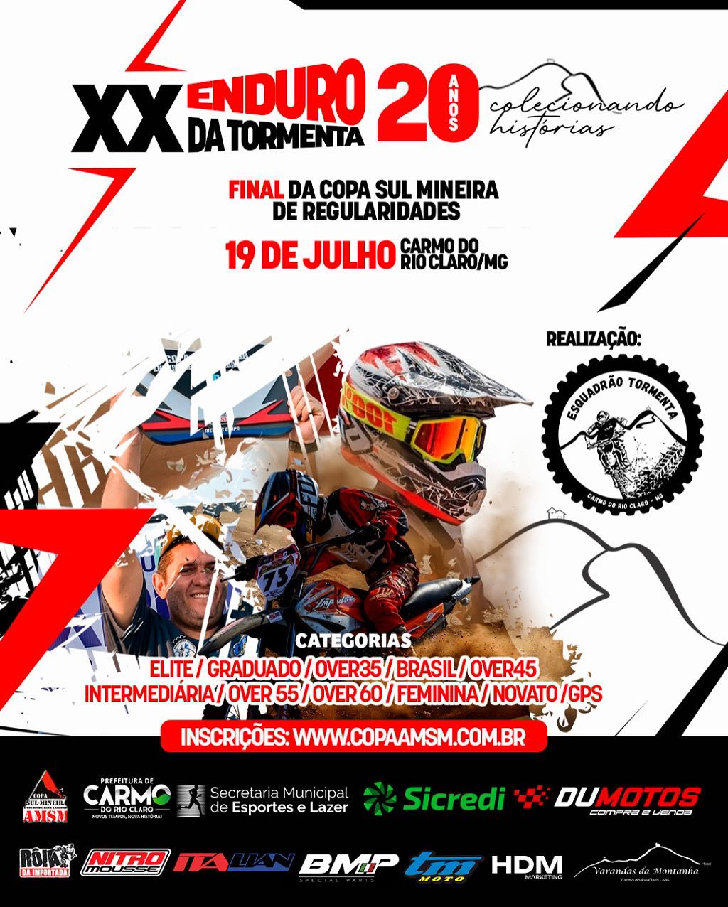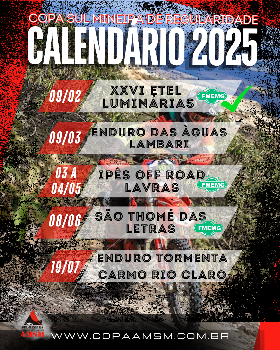 Preparados para mais desafios ?    Confira o Calendário AMSM 2025 : 09/02 – XXVI ETEL – Luminárias/MG – 09/03 – VI Enduro Serra das Águas – Lambari/MG 03 e 04 de maio – XXVI Enduro dos Ipês – Lavras/MG 08/06 – XIII Enduro de São Thomé das Letras/MG 19/07 – Enduro da Tormenta – Carmo do Rio Claro/MG. www.copaamsm.com.br